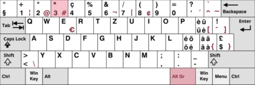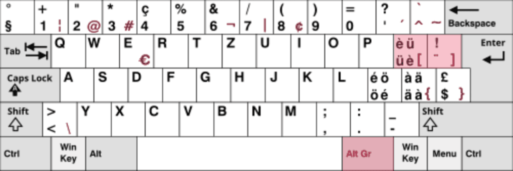 Die «speziellen» Sonderzeichen, die Du vielleicht nicht so oft benötigst, kannst Du schreiben, indem Du gleichzeitig die «Alt Gr»-Taste und die entsprechende Taste drückst. Diese sind oben in der Farbe Rot.