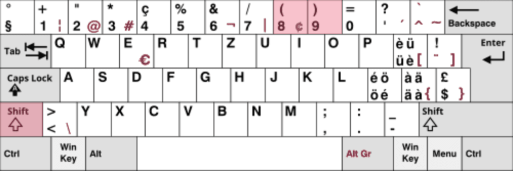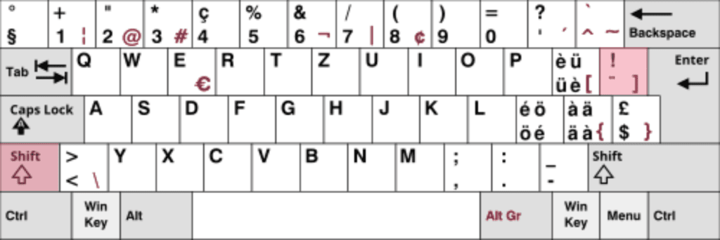 Die normalen Sonderzeichen, die Du für den Alltag brauchst, kannst Du ganz einfach schreiben, indem Du gleichzeitig die «Shift-Taste» und die entsprechende Taste drückst. Diese sind oben in der Farbe Schwarz.